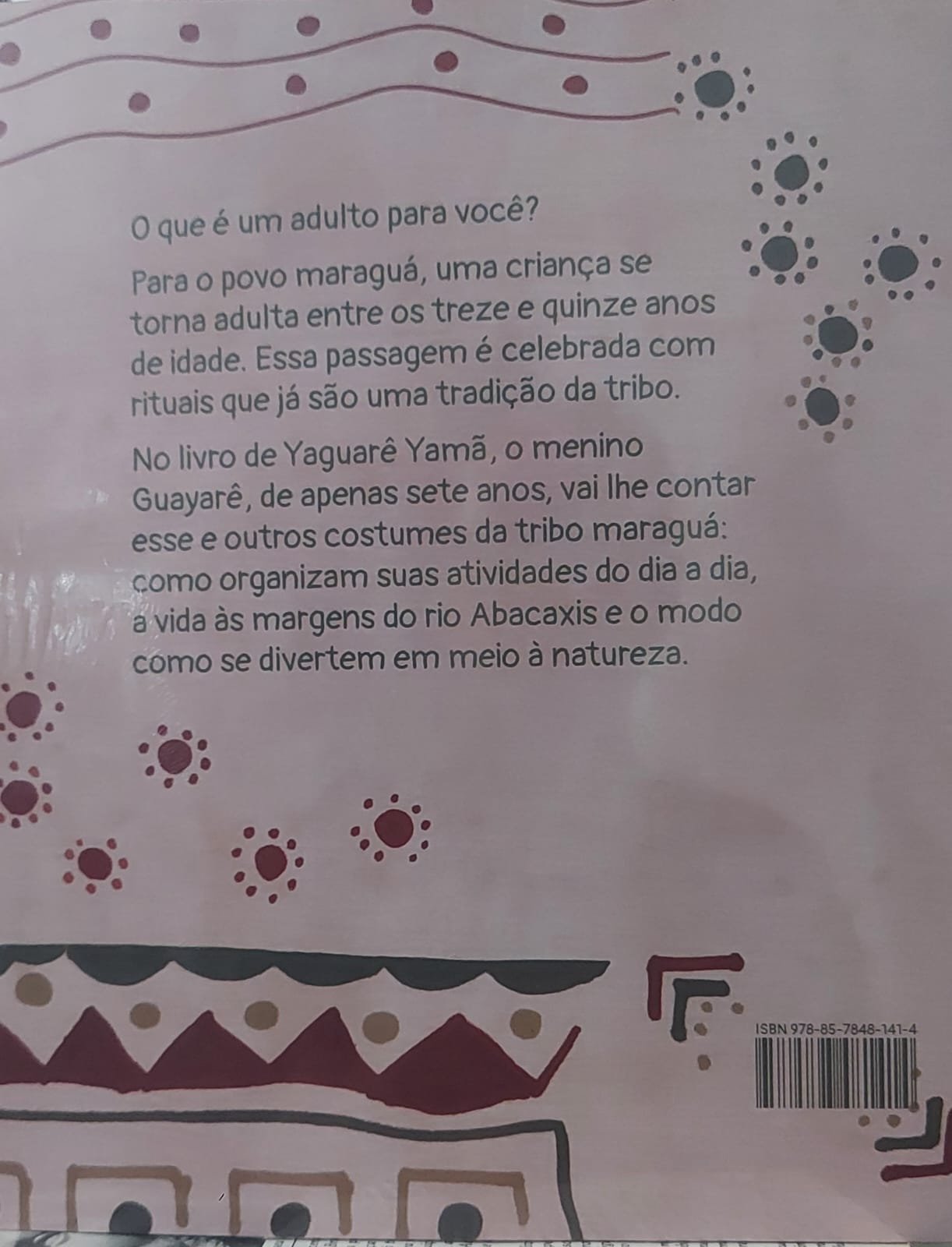 O que é um adulto para você? Para o povo maraguá, uma criança se torna adulta entre os treze e quinze anos de idade. Essa passagem é celebrada com rituais que já são uma tradição da tribo. No livro de Yaguarê Yamã, o menino Guayarê, de apenas sete anos, vai lhe contar esse e outros costumes da tribo maraguá: como organizam suas atividades do dia a dia, a vida às margens do rio Abacaxis e o modo como se divertem em meio à natureza. :: Livro bilíngue: Português/Maraguá ::