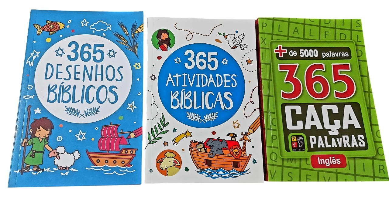 Kit com 3 Livros, 365 Desenhos Bíblicos para Colorir, 365 Atividades Bíblicas para Responder, 365 Caça palavras em Inglês