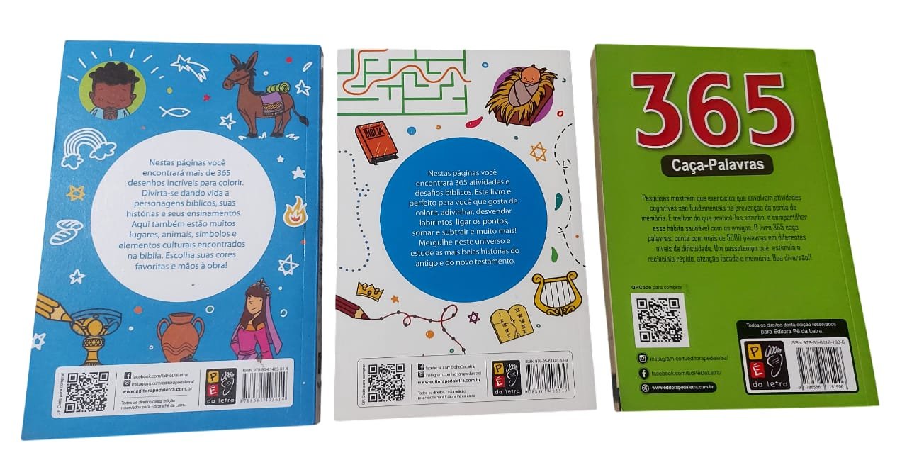Kit com 3 Livros, 365 Desenhos Bíblicos para Colorir, 365 Atividades Bíblicas para Responder, 365 Caça palavras em Inglês.